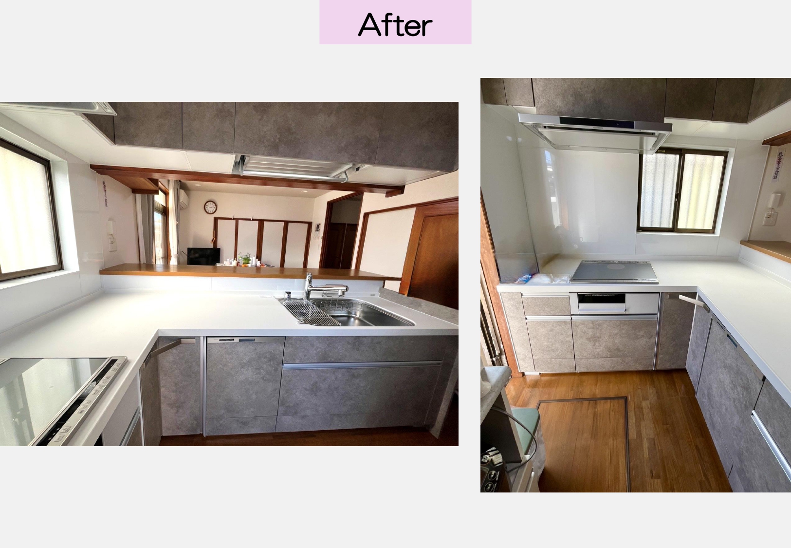 【 施工事例 】 * 使い勝手を向上させたキッチンへ * 長くご使用されていたL型キッチンをリフォーム。 使い勝手が向上するように IH・浄水器付水栓・洗えるレンジフード・食洗機 昇降吊り戸・マグネットパネル 等に変更するプランをご提案しました。 キッチン前のカウンターもリペアを行い綺麗に仕上げ、 キッチン全体が明るく一新しました!![]()